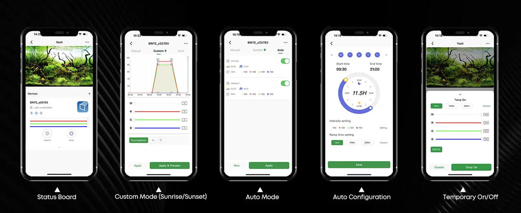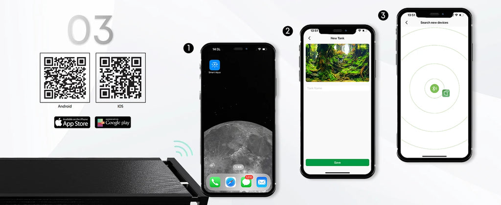 "Smart Aqua" App is compatible with both iOS and Android systems, offering a range of features including control panel access, temporary light on/off, and manual/auto/custom mode settings.