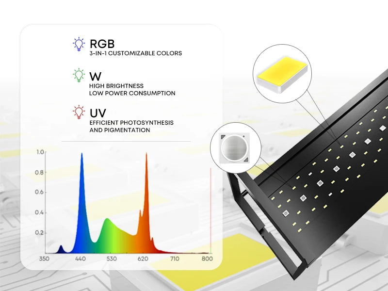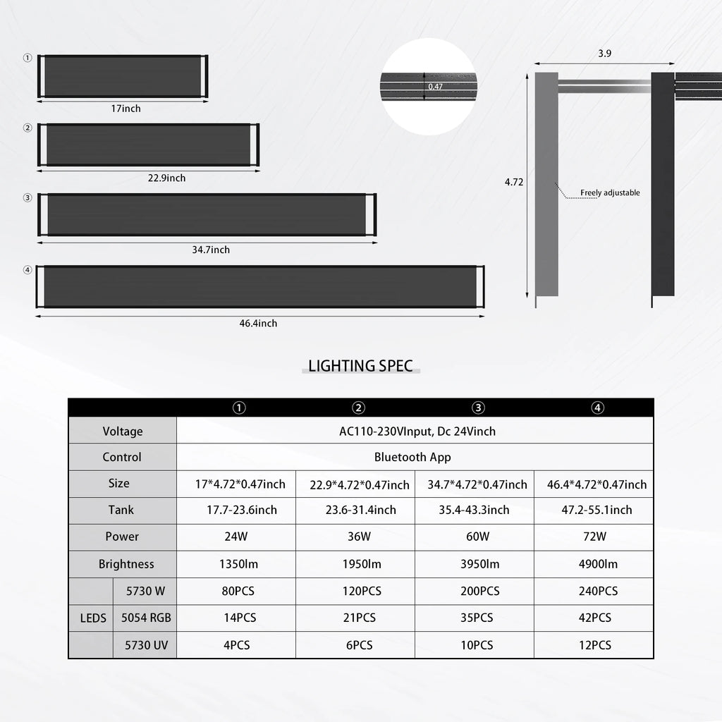 Featuring RGB, W, and UV LEDs, the BRITE series aquarium led light sets itself apart with a broader light emission (4 inches) and more LEDs (6 rows) compared to other fixtures. Users can effortlessly customize light colors to their preference, while the full-spectrum W LEDs deliver high brightness with minimal power consumption. Furthermore, UV LEDs effectively stimulate growth and enhance coloration, making it an ideal choice for both aquatic plant cultivation and ornamental fish tank illumination.