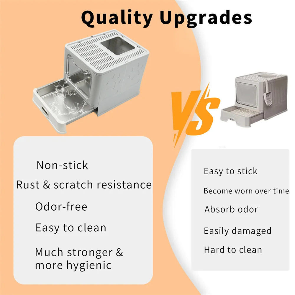 Stainless Steel Construction - The box has a drawer-type stainless steel tray, which is much stronger and last longer than the plastic, stainless steel is known for exceptional strength and durability, means that it can stand daily use, highly resistant to wear and tear, scratches and staining, its non-porous surface prevents absorption of urine, odor, easier to rinse with water for clean, the ease of maintenance ensures that pet owners do not need to spend excessive time on cleaning, while also reducing the frequency of litter box replacements