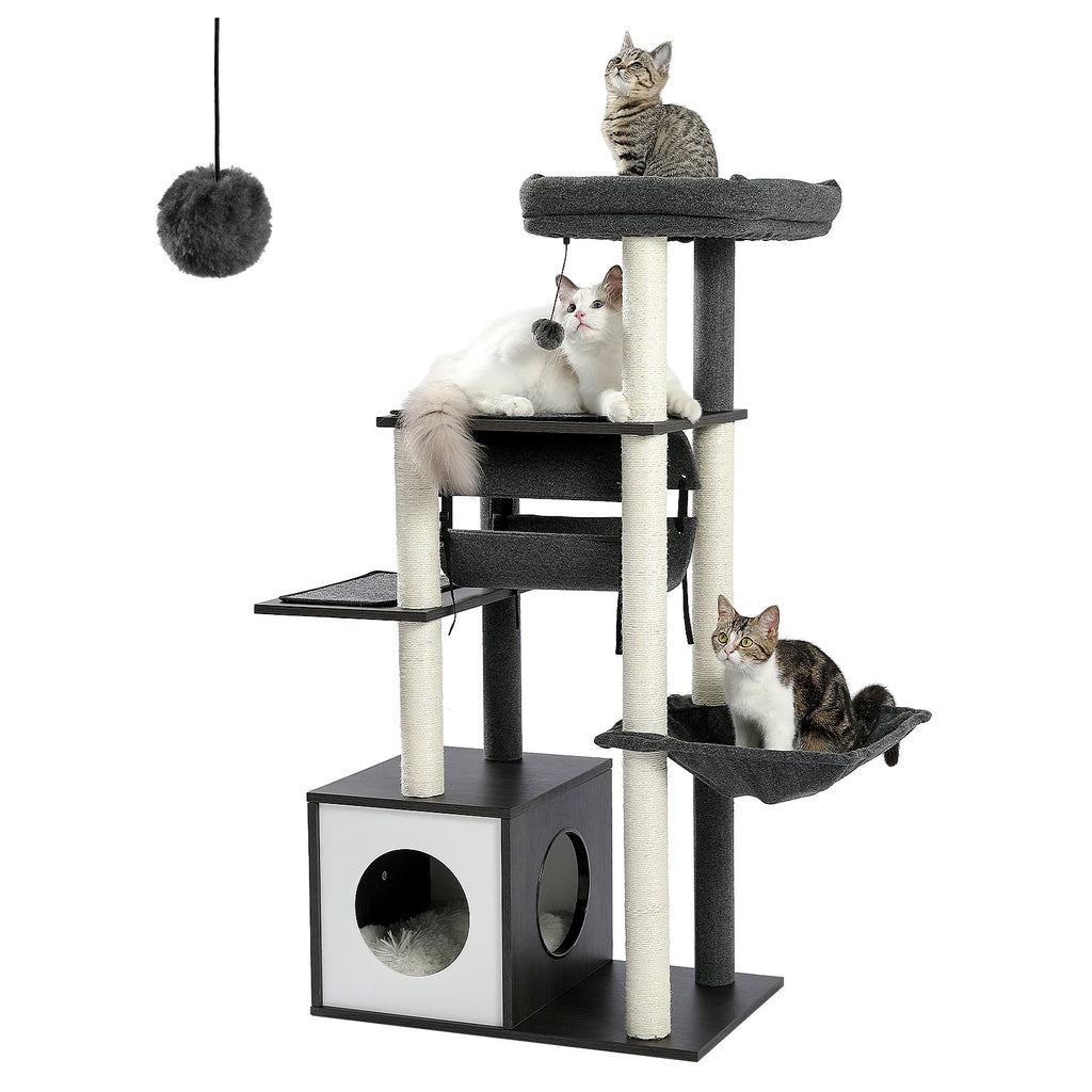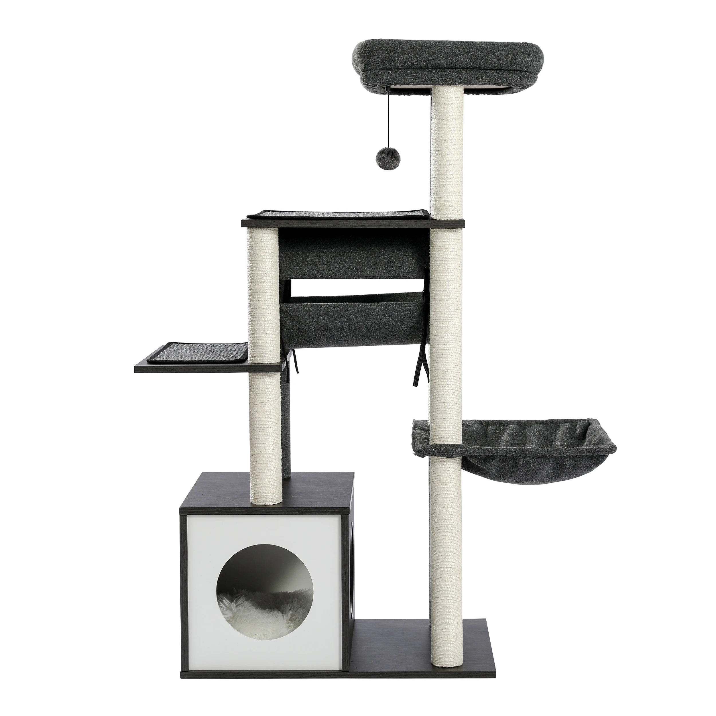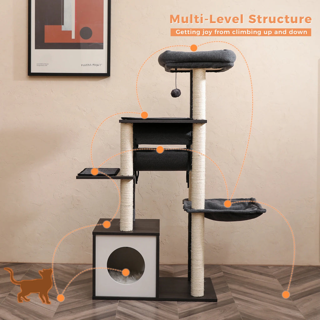 Modern Cat Tree for Indoor Cats Wooden Cat Tower with Sisal Covered Scratching Posts Cozy Condo Hammock Swing Tunnel Cat Toys