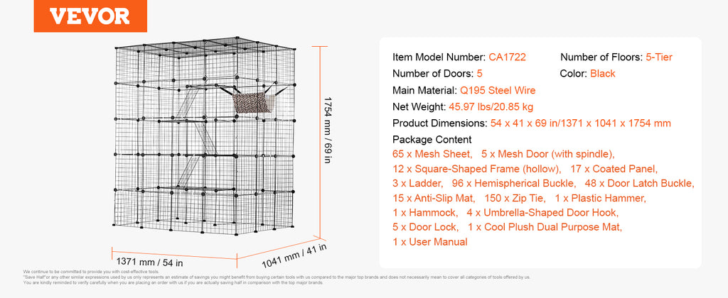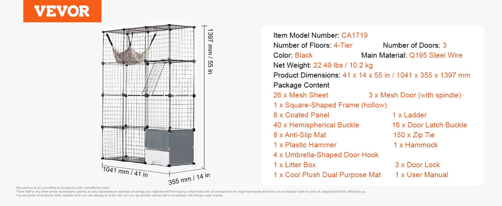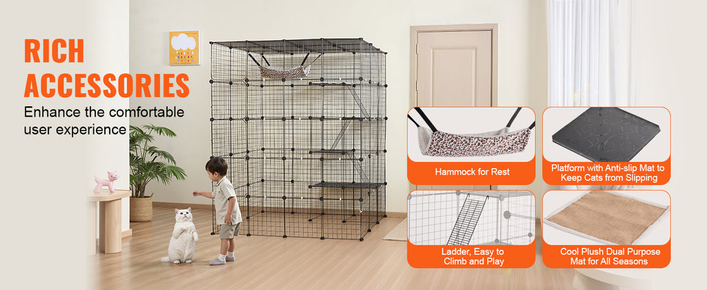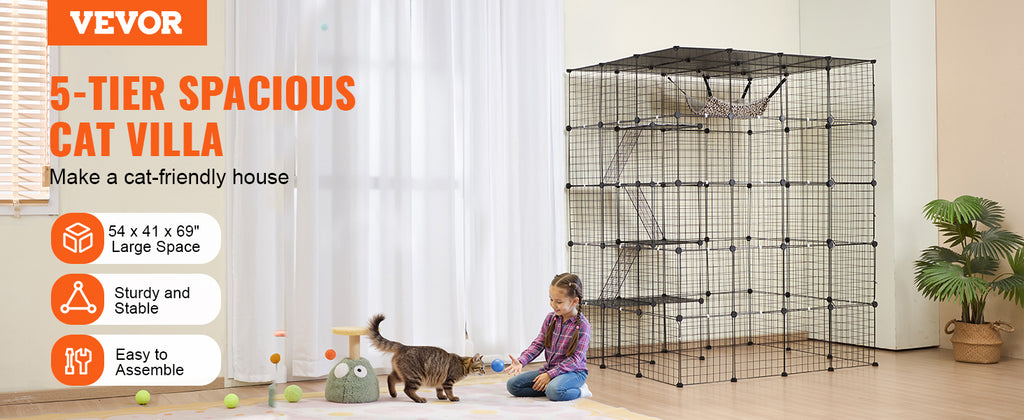 Sturdy & Secure: Made of premium metal wire covered with anti-rust spray powder coating, the frame is very sturdy, and hard to break or distort readily. Thickened PVC plastic board can provide a stable support for cats to keep them from falling. Reinforced door latch buckle and zip tie to ensure the stability of the cat house. The 1/2'' interval between each wire is small enough for the cat to climb or jump without injury.
